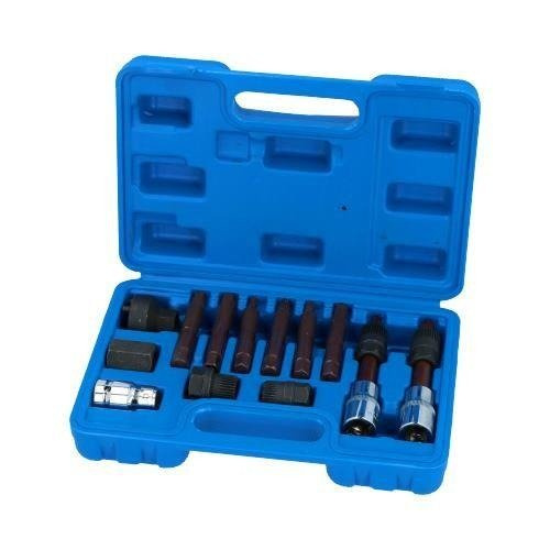 - Zestaw 13-stu kluczy do monta u i demonta u alternatorów ze sprzęgłem typu Bosch i Magneti Marelli . Pasuje do samochodów marek: Audi, BMW, Fiat, Ford, Mercedes, Opel, Porsche, Renault, Peugeot, Seat, Skoda, Volvo, VW i innych PARAMETRY Klucze umo liwiają jednoczesne odkręcanie śruby mocującej koło pasowe (za pomocą odpowiedniego bitu) oraz przytrzymywanie koła ze sprzęgłem (za pomocą specjalistycznej nasadki). WYSOKIEJ JAKOŚCI STAL CR-V (CHROME VANADIUM).