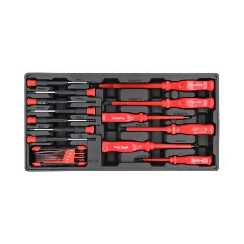 - Wkład 14elem.: -śrubokrętów w izolacji: płaskie: 4x100 5,5x125 6,5x150 krzyżakowe: 3x75 2x100 1x100 -precyzyjne: płaskie: 1,8mm 2mm 2,5mm 3mm krzy akowe: 3szt -zestaw torx: T9,T10,T15,T20,T25,T27,T30,T40,